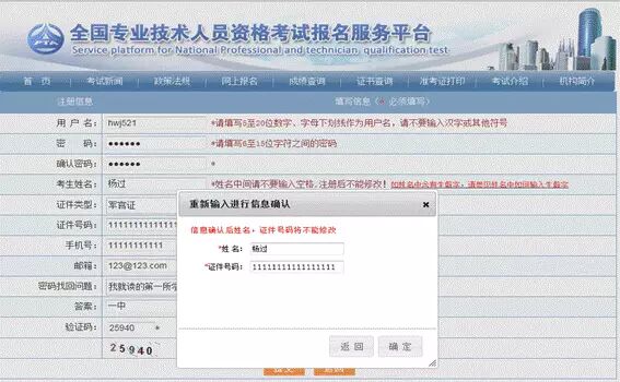 填写完毕确认无误后点击【提交】,出现信息确认,需要考生重新输入姓名、证件号码进行确认。如下图所示: