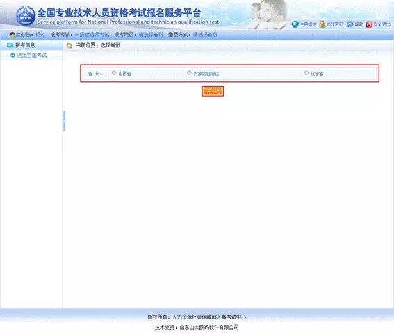 选择考试:照片上传完成后,点击左侧的【进入网上报名】,在右侧的考试列表中选择要报考的考试,点击【选择】按钮进入选择省份界面(见下图)。