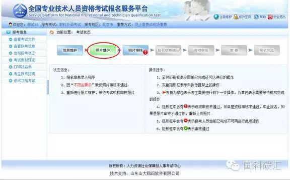 报名照片审核:老考生提交报名信息之后需要考试管理机构对所上传的照片进行审核,审核通过后方可进行下一步操作,如果审核不通过可以点击流程图中的照片维护进行修改,修改后的照片需要考试管理机构重新审核。(见下图)