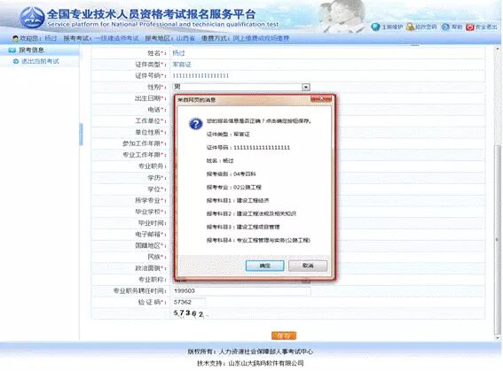 填写报考信息:首先选择报考人员所在地市和审核点,接着选择报考级别和报考专业,选择报考的考试科目,如实填写本人其它报考信息(见下图)。填写完成之后,输入验证码并点击【保存】,会出现保存信息确认框,包括证件类型、证件号码、姓名、报考级别、报考专业以及考试科目的信息,经核对无误后,点击【确定】按钮(见下图)。