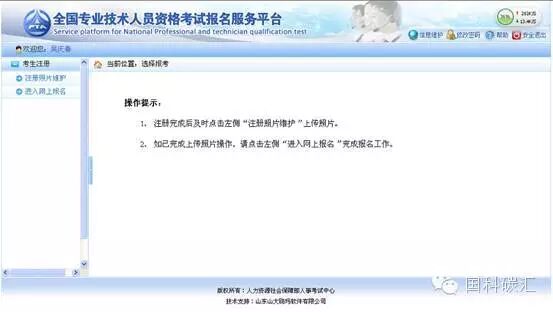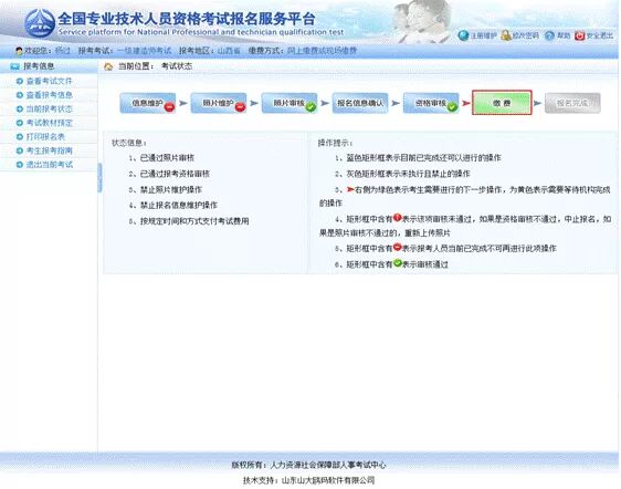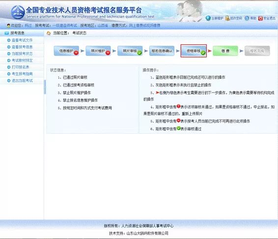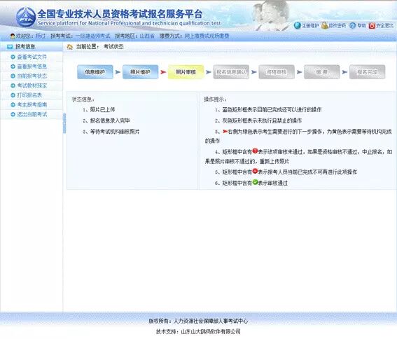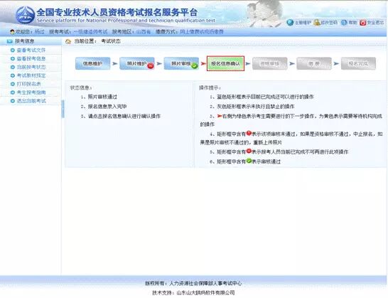 界面左侧显示状态信息,右侧显示操作提示,请报考人员参考上述信息进行相关操作,直到报名完成。