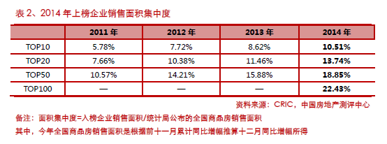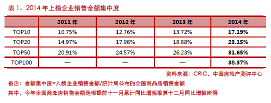2014年房地产企业集中度继续大幅提升,TOP10、TOP20和TOP50的金额和面积集中度上升幅度均高于前几年, TOP100企业金额和面积集中度分别达到38.37%和22.43%。